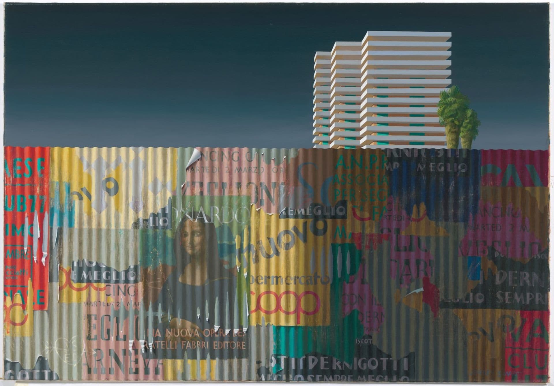 In the initial study for Corrugated Gioconda Smart developed the composition by painting directly onto the cover of a 1970s bank calendar. He incorporated a reproduction of the painting The gift of the ring, wedding scene between Sienese noble families 1473 by Sienese artist Sano di Pietro, using the text from the image to delineate the corrugations of a metal fence. In the final work Smart replaced di Pietro’s image with Leonardo da Vinci’s Mona Lisa or La Gioconda c 1503, one of the most powerful icons of European culture. Depicted as a torn poster, a reproduction of a reproduction, Smart wryly draws our attention to the power of art and images to enter our daily lives.