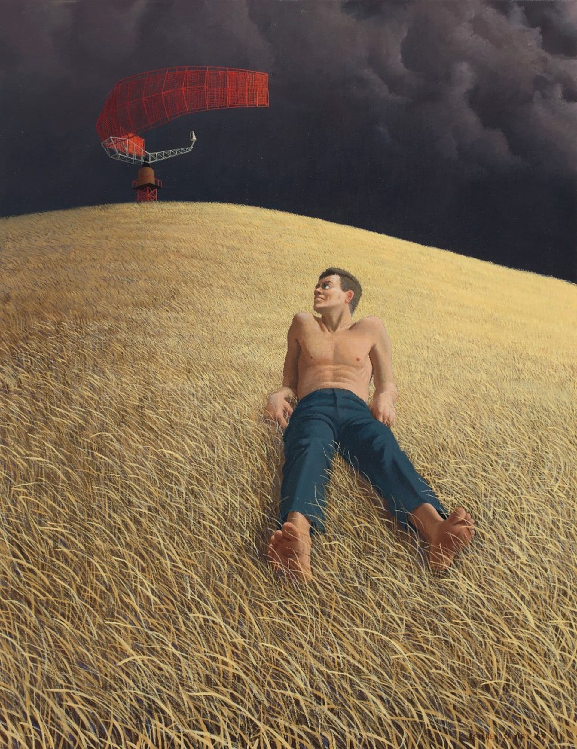 At the height of the Cold War, radars and satellites enabled countries to spy on each other in increasingly sophisticated ways. They also played a part in the ‘Space Race’ between the United States of America and the Soviet Union in the mid 1950s to launch objects into space. Smart’s inclusion of radar dishes and control towers in his paintings suggests the transmission and reception of signals for domestic application and purposes of surveillance. The male figure in The listeners turns his head towards a radar dish and listens intently. In turn, the distant radar dish is also listening.