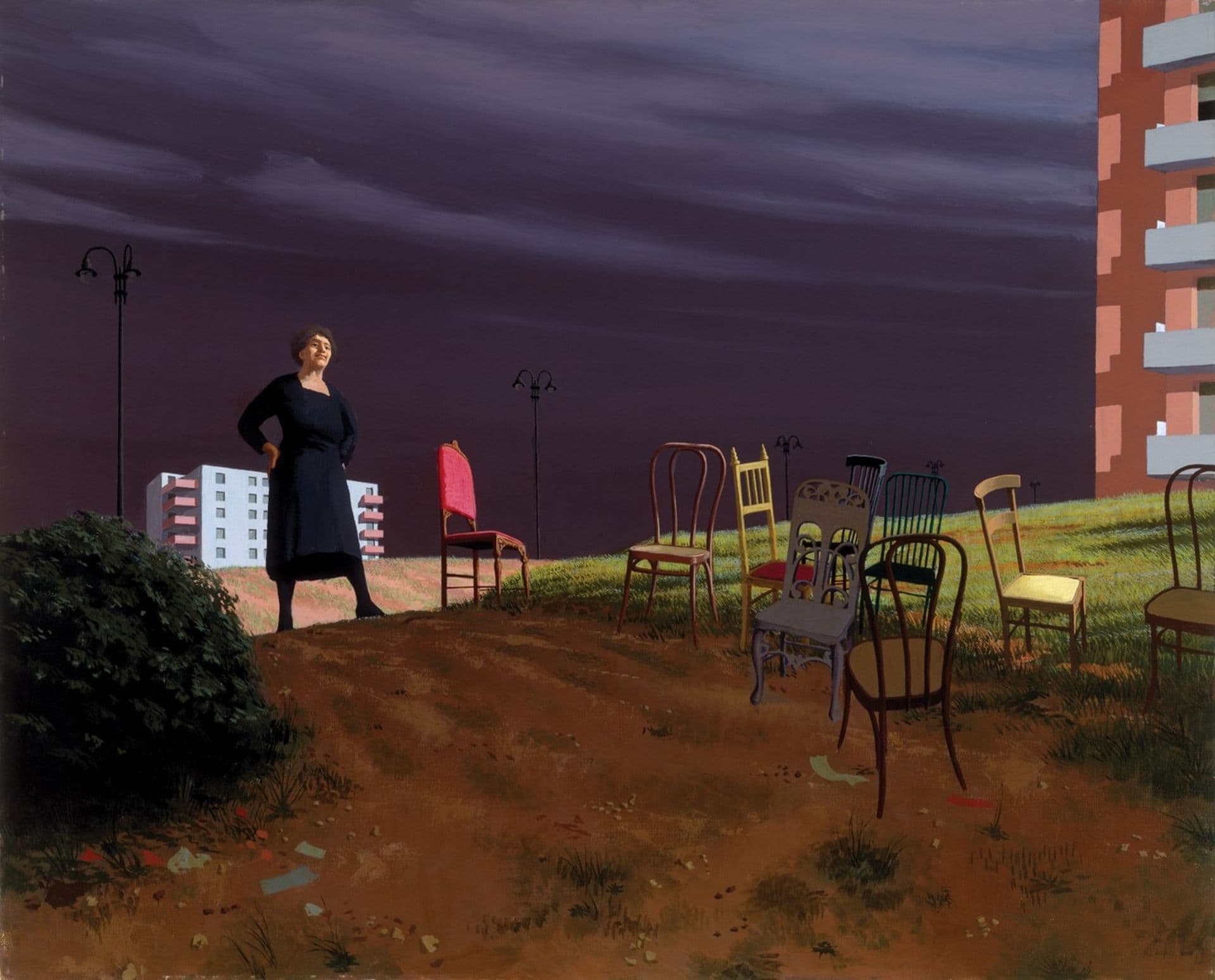This painting brings together visual motifs that are mundane in the real world but take on an uncanny and dramatic presence on the canvas. A woman dressed in black presides over an array of chairs in a seemingly random scatter. Occasionally spot-lit like an actor in a play, each chair has its own distinct character. Similarly, the female figure is like a character in a film and recurs in many of Smart’s paintings of this period, such as Spring landscape and Piraeus II. These paintings seem to draw on the atmosphere of the Italian cinema Smart admired such as Vittorio De Sica’s neo-realist film Bicycle thieves (1948).